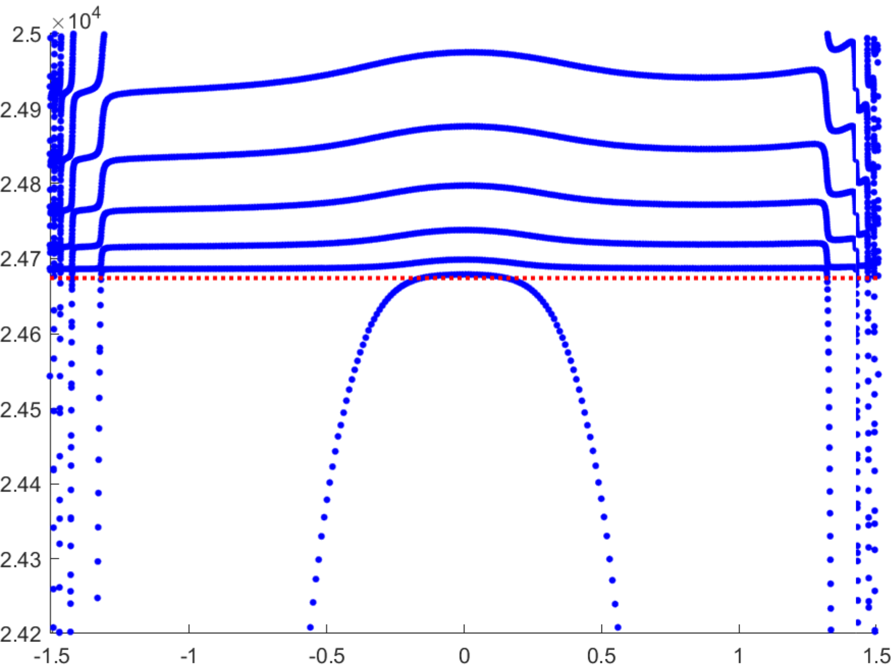 Additionally, this breathing phenomenon gives birth to an extremely short spectral band (in magenta) which goes down below the critical value \(\pi^2/\varepsilon^2\).