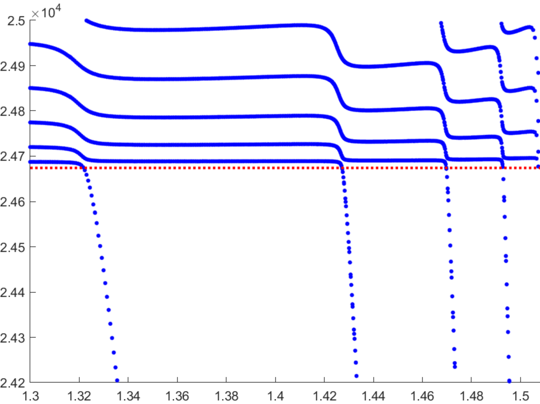 (the right picture is a zoom of the left around \(\alpha=1.4\) and the red dotted line marks the value \(\pi^2/\varepsilon^2\)).